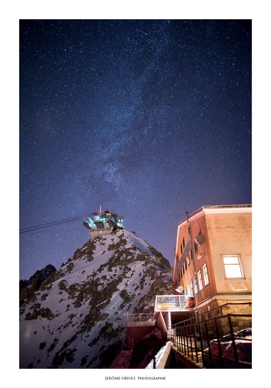 Avant 2016, on y accédait uniquement par le glacier, mais je découvre qu’a été construit en même temps que la réfection de la gare d’arrivée du télécabine un grand tunnel qui permet d’y accéder désormais sans prendre aucun risque. Au refuge, on doit être une dizaine de personnes: uniquement des alpinistes, deux guides de haute-montagne et moi. Après quelques photos de nuit autour du refuge, je rentre me coucher, et accessoirement me réchauffer car fin décembre à 3400m la nuit, il fait un peu frisquet!!