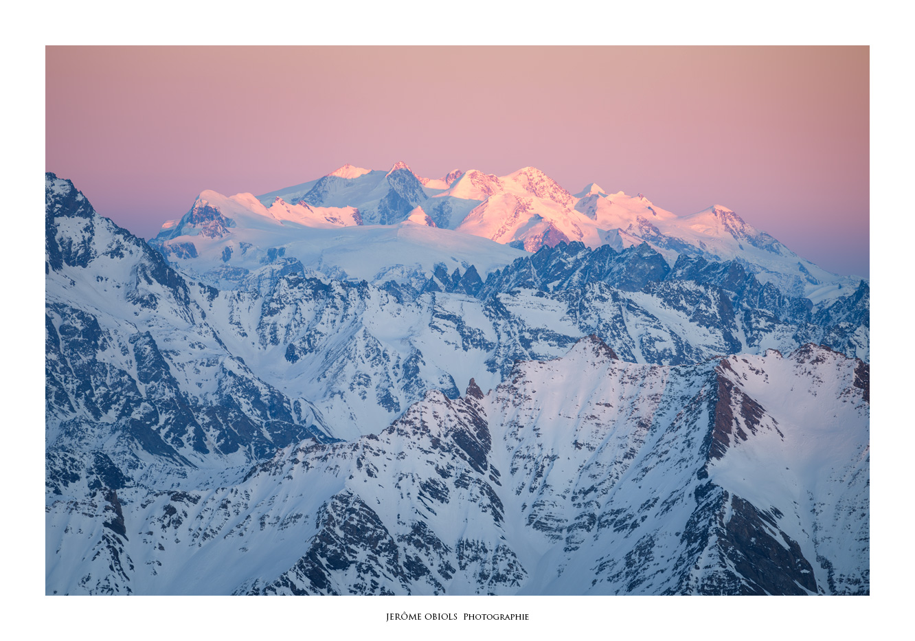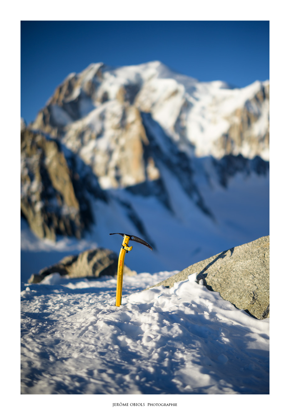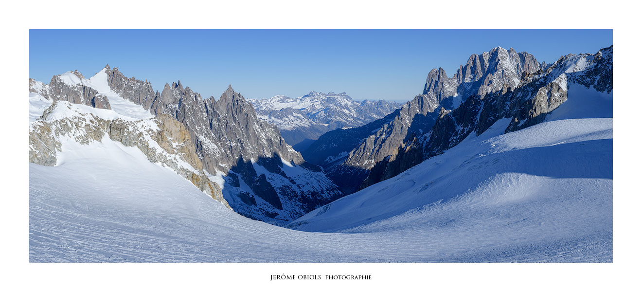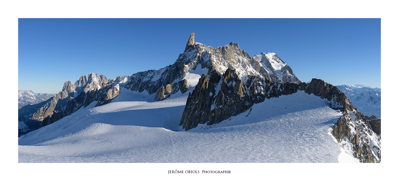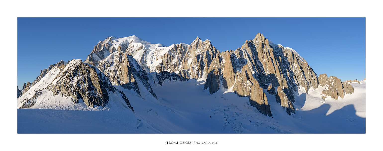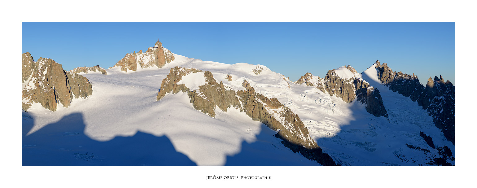 Le lendemain matin, je ne résiste pas à l’envie d’aller un peu promener. Mais je suis seul, et même si j’ai emmené mes crampons, un piolet, un baudrier et une broche, tout cela ne me protège aucunement d’une chute en crevasse! Je rejoins le col des Flambeaux, à une centaine de mètres de la Pointe Helbronner. Hors de question d’aller plus loin, la zone est ensuite trop crevassée pour m’y aventurer seul. Je me contente de gravir le Petit Flambeau (3407m) qui m’offre une vue panoramique sur tout le massif et isolée des câbles disgracieux du télécabine.